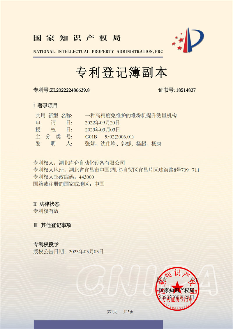 一種高精度免維護(hù)的堆垛機(jī)提升測量機(jī)構(gòu)專利證書
