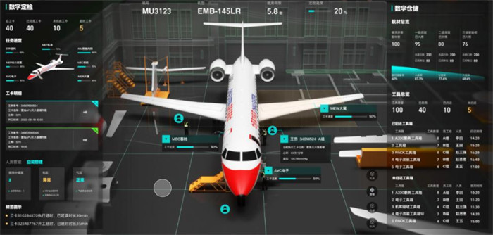 4.維修機(jī)庫數(shù)字孿生:運(yùn)用數(shù)字孿生技術(shù),對(duì)維修機(jī)庫進(jìn)行數(shù)字化還原,實(shí)現(xiàn)物理機(jī)庫與虛擬機(jī)庫的實(shí)時(shí)同步。通過數(shù)字孿生機(jī)庫,可以實(shí)時(shí)查看飛機(jī)的維修進(jìn)度、設(shè)備的運(yùn)行狀態(tài)、人員的工作情況等信息。